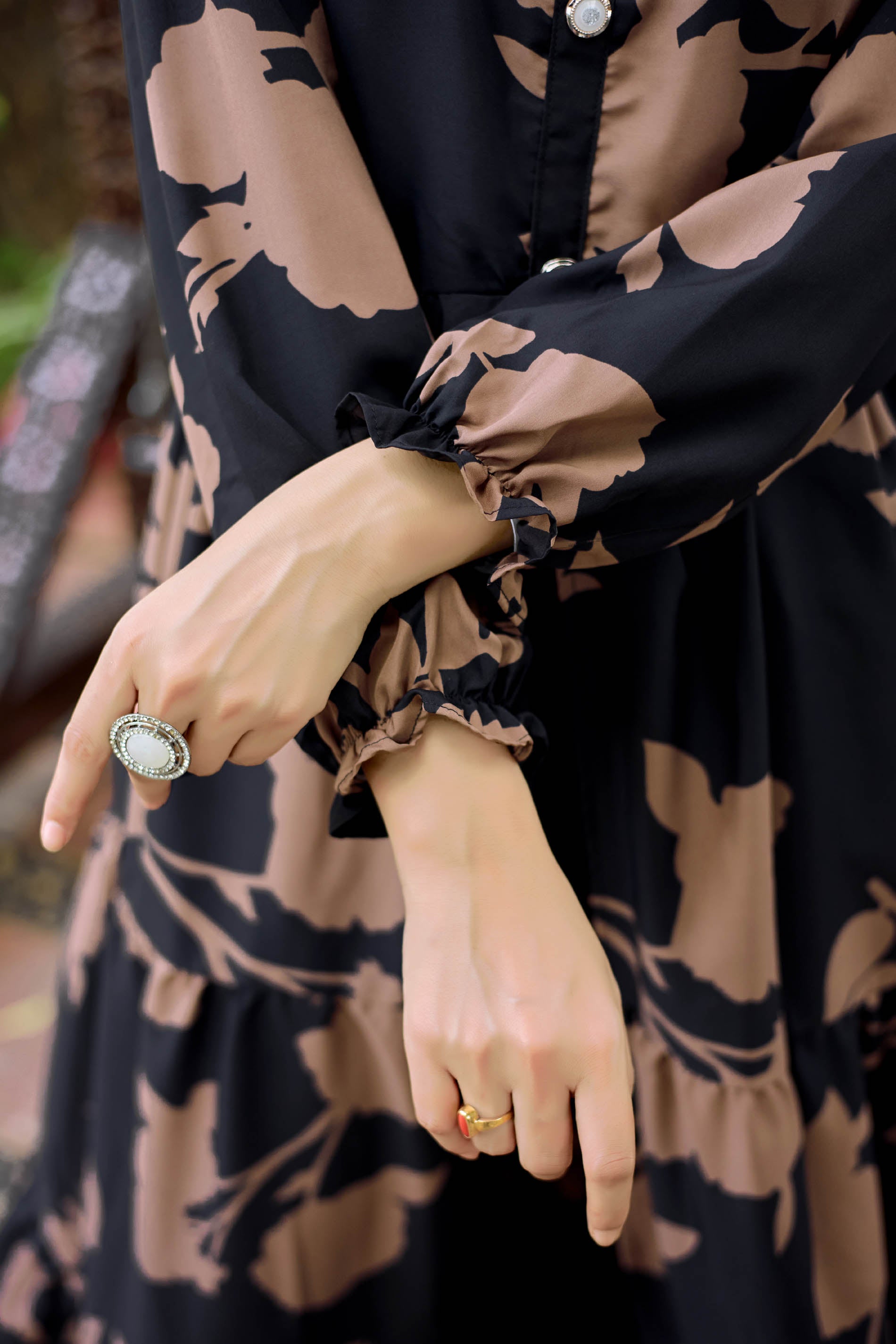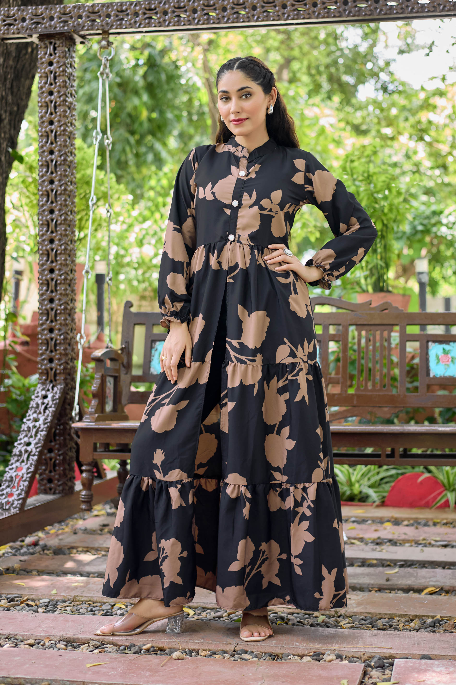 Black Floral Printed Long Maxi Dress for Women – Full Sleeve Stylish Ethnic Wear with Button Detail
