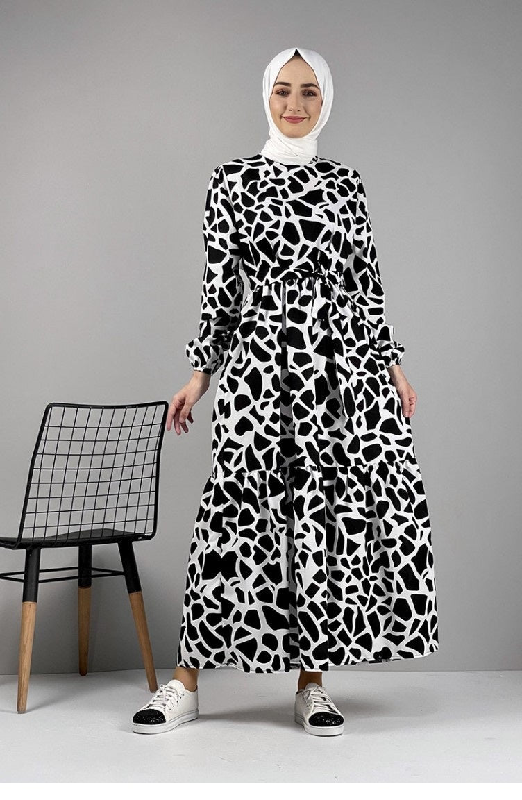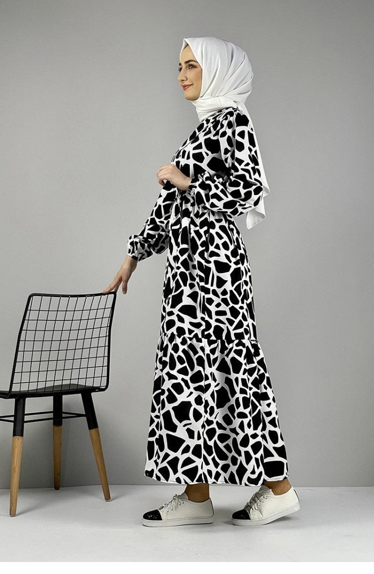 Women's Black & White Abstract Print Maxi Dress with Belt & Full Sleeves
