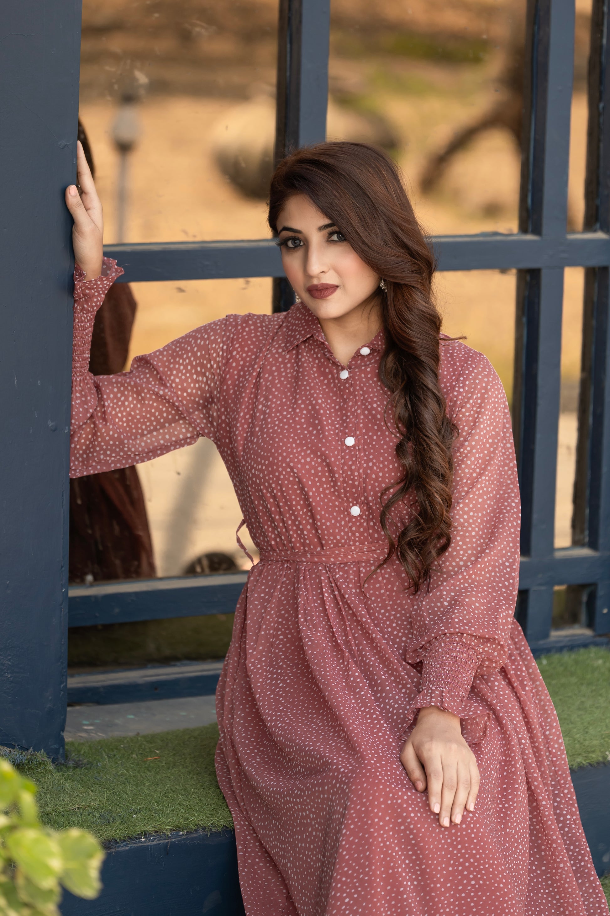 Women's Rust Red Polka Dot Long Maxi Dress with Buttoned & Full Sleeves