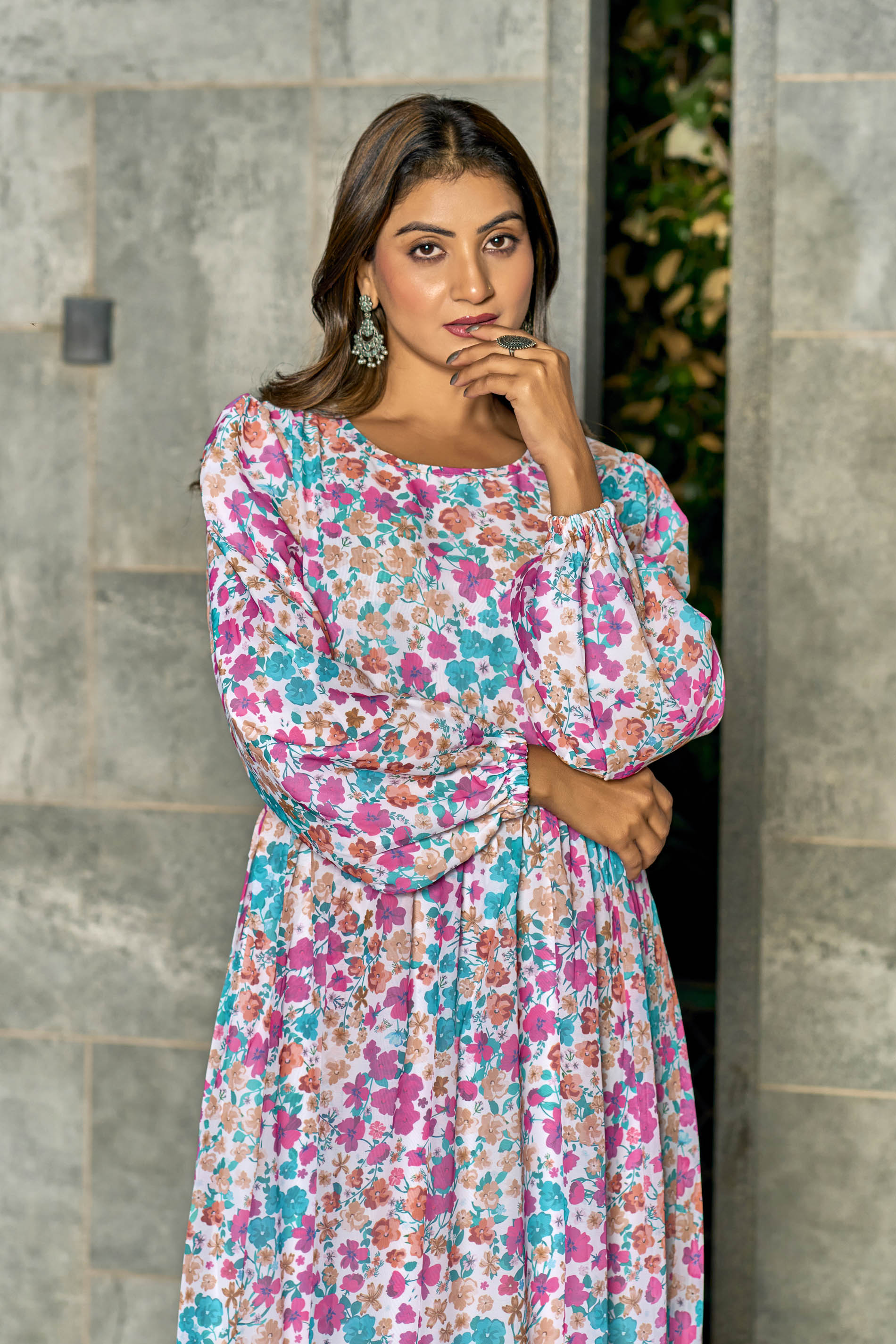 Georgette Fabric, with Crepe lining for no transparancy, Frill Pattern, Floral Print, Bishop Sleeves with Elastic Cuffs, Puff Sleeve Pattern, Without Dupatta,