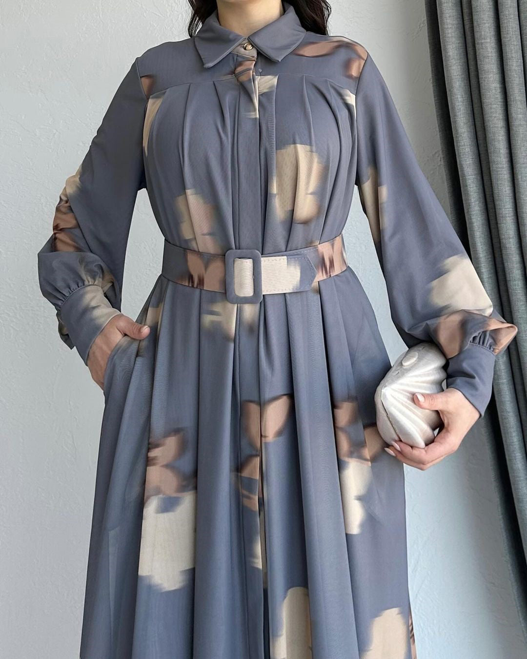 Elegant Grey Pleated Maxi Dress with Floral Print, Belted Waist & Side Pockets