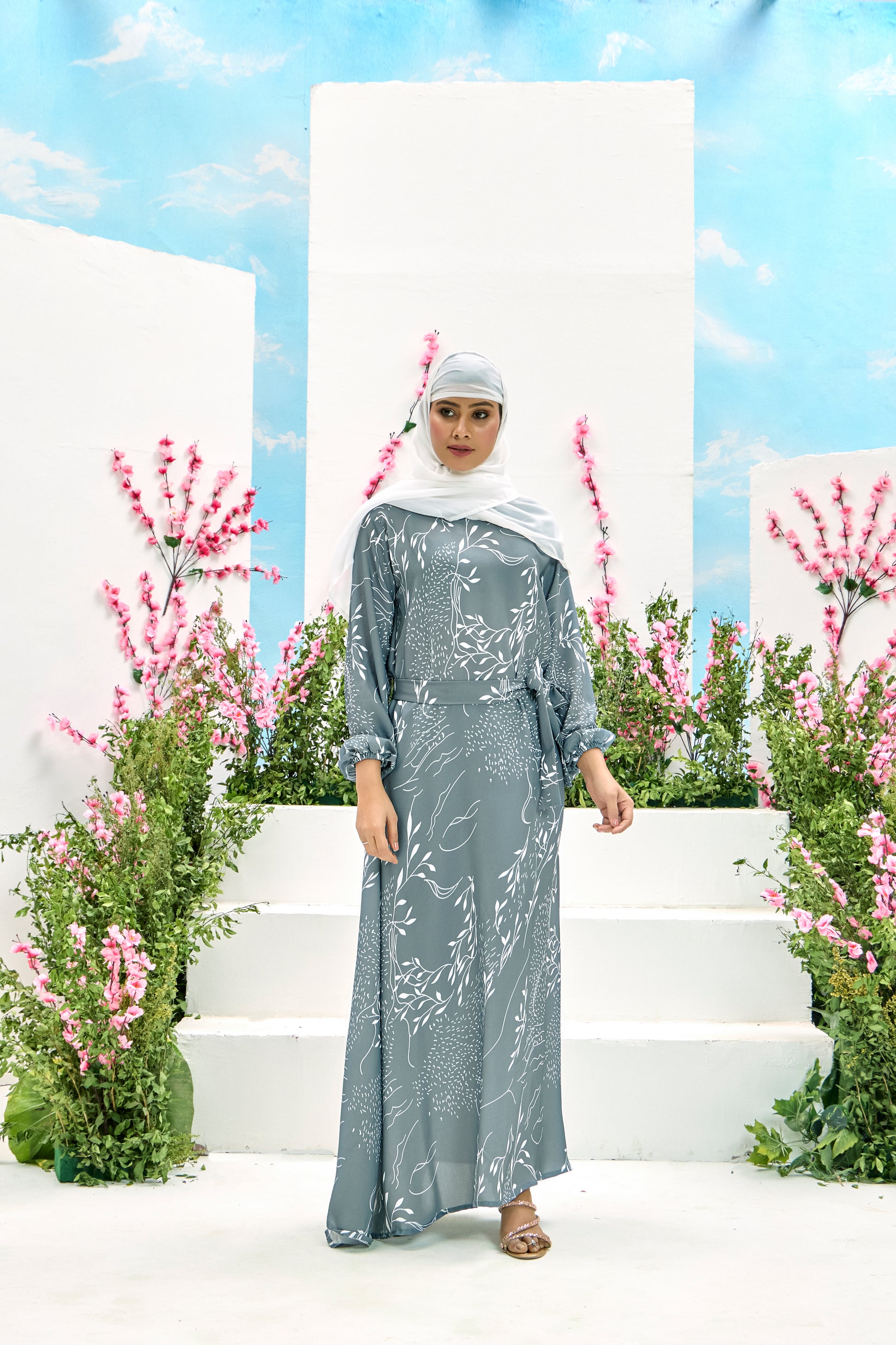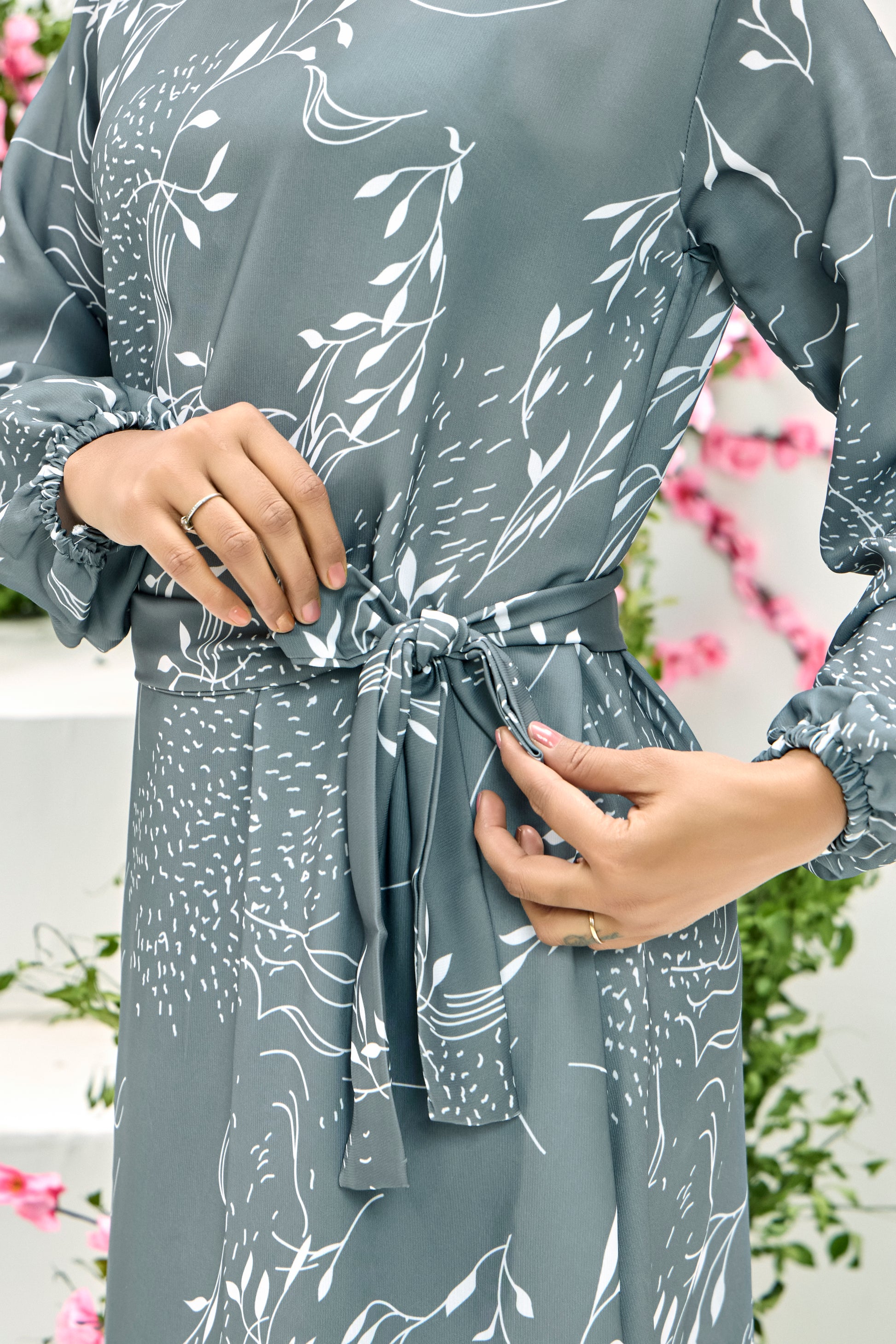 Elegant Grey Printed Maxi Dress with Belt – Modest Full Sleeve Abaya for Women