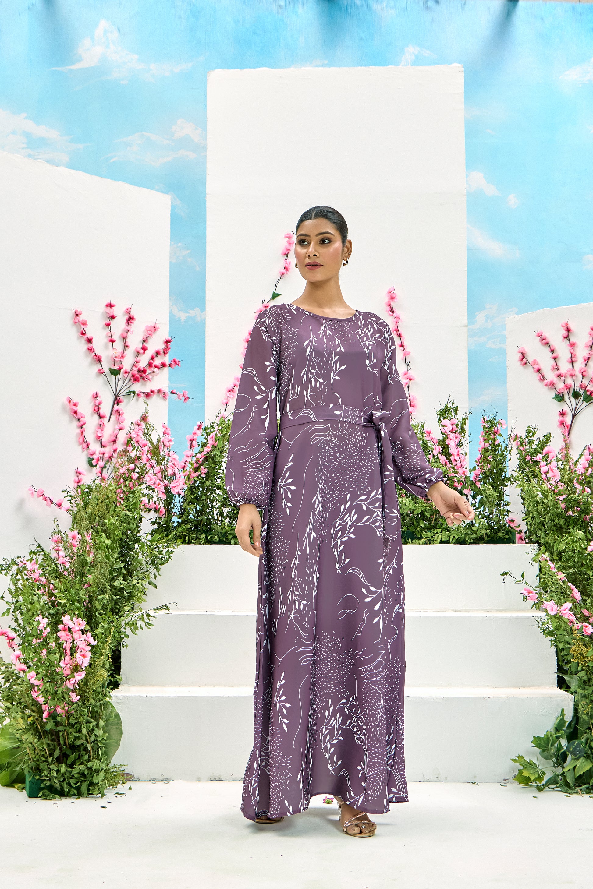 Elegant Maroon Printed Maxi Dress with Belt – Modest Full Sleeve Abaya for Women