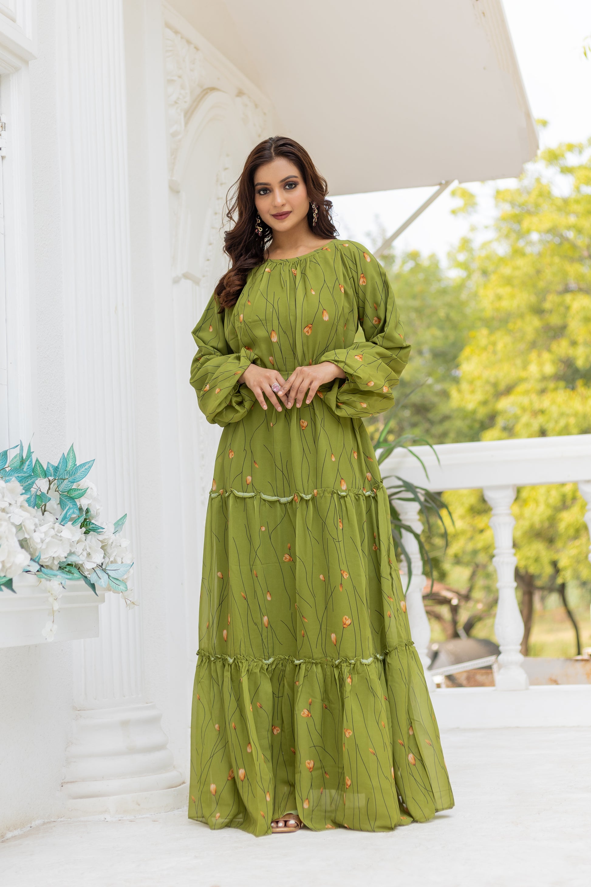 Women's Olive Green Floral Printed Full-Sleeve Tiered Maxi Dress with Round Neck,