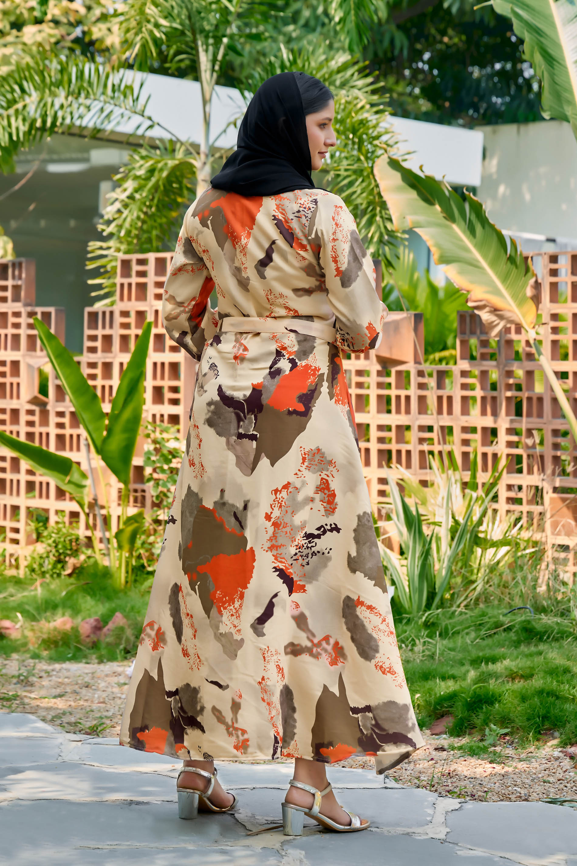 Multi-Color Abstract Print Maxi Dress – Modest Full Sleeve Abaya for Women