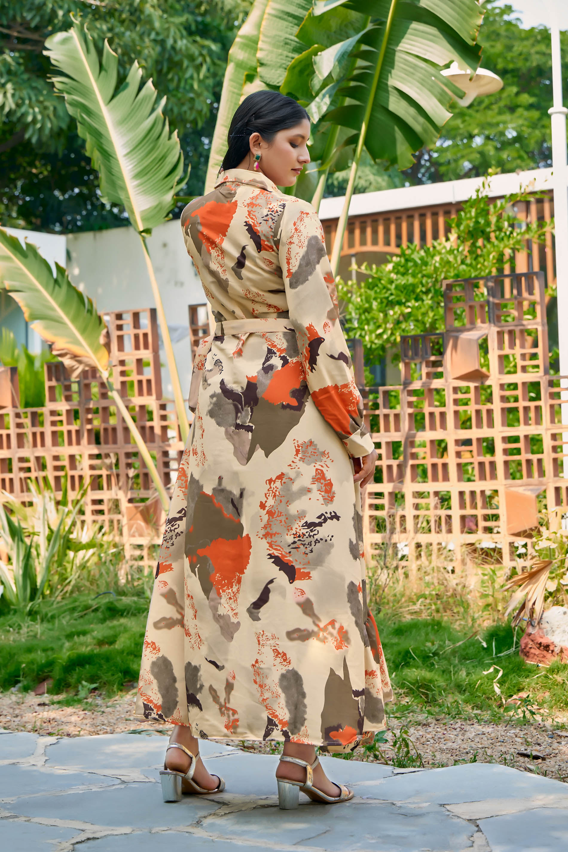 Nida fabric, no transparency, front button open pattern, abstract print, shirt style cuffs, regular sleeve pattern, with belt, front open buttons feeding friendly, without dupatta,s