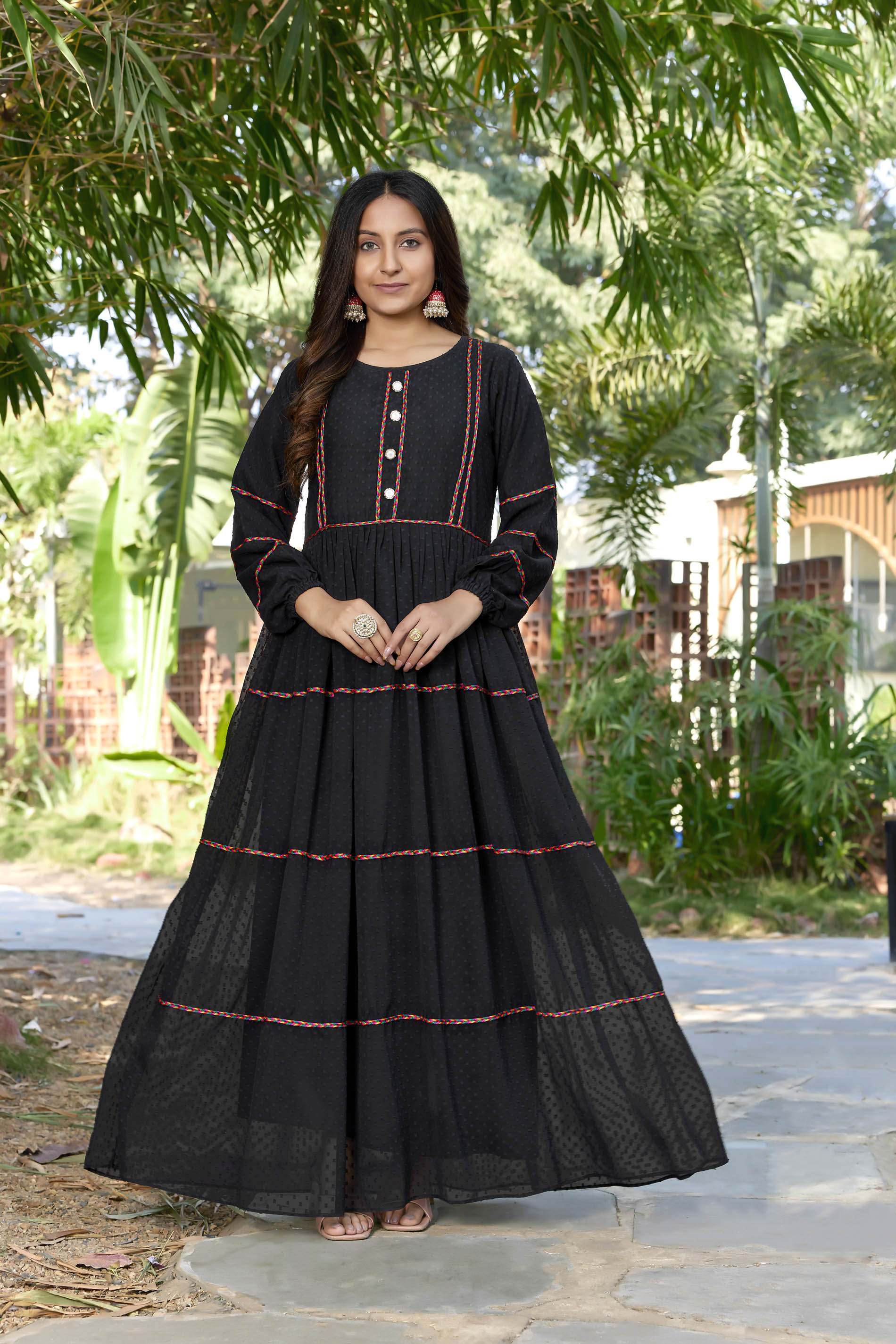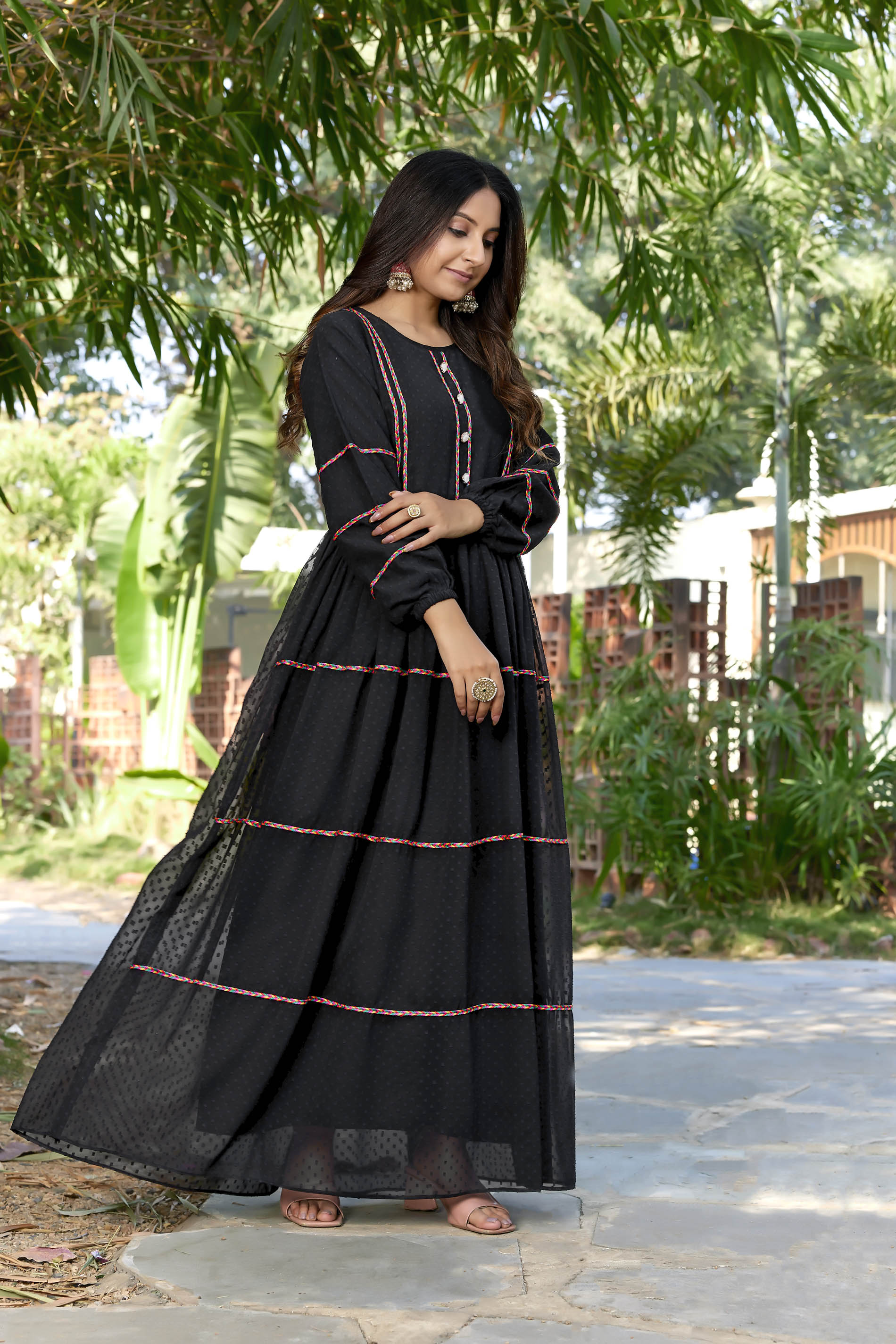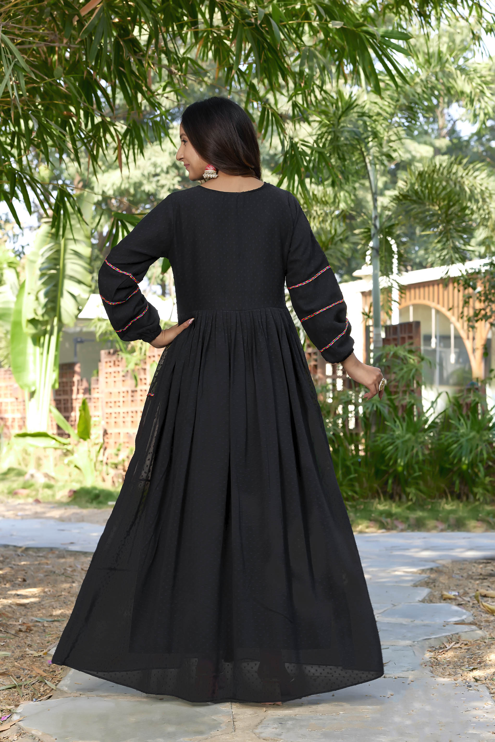 SARINKU Black Georgette Fabric with Crepe lining for no transparency Gajjing & Lace Pattern Bishop Sleeves with Elastic Cuffs Balloon Sleeve Pattern Without Dupatta