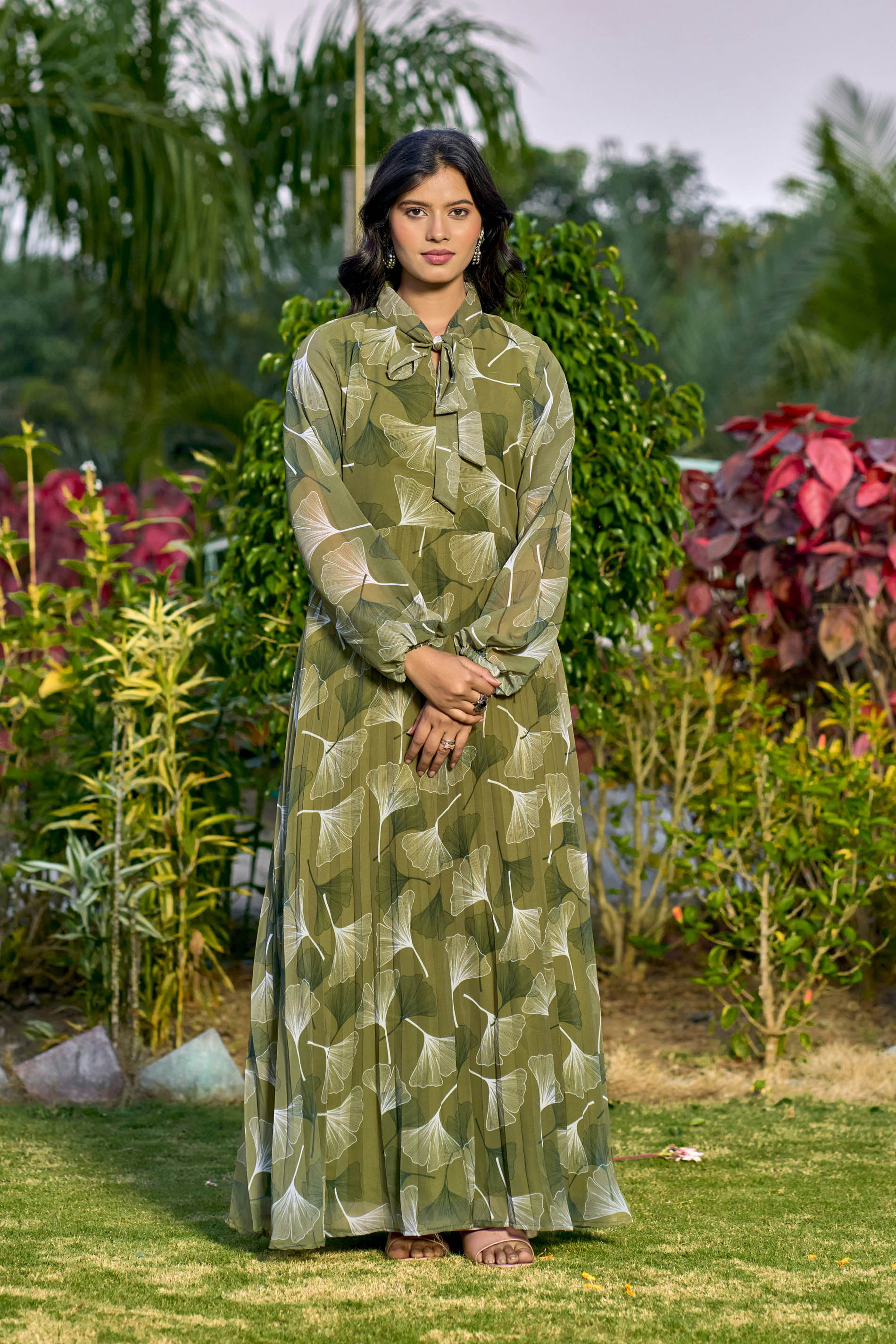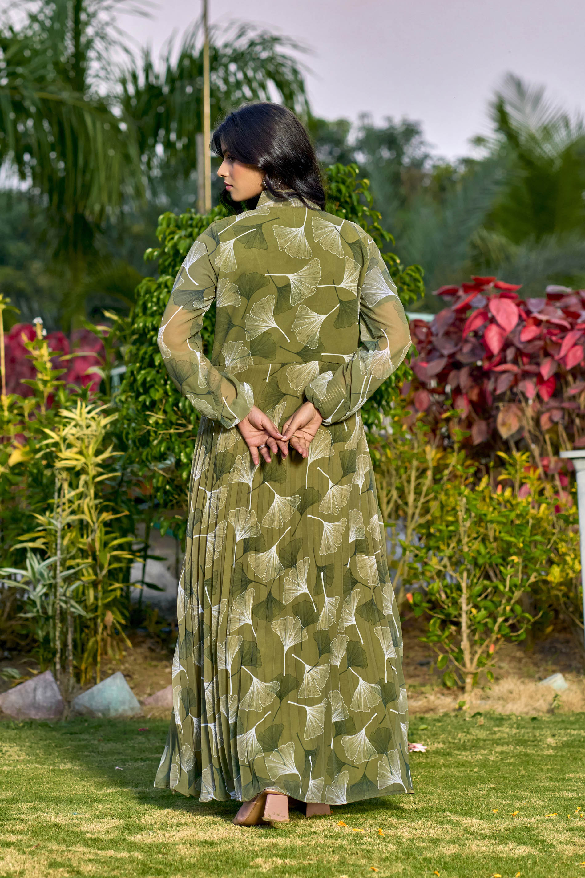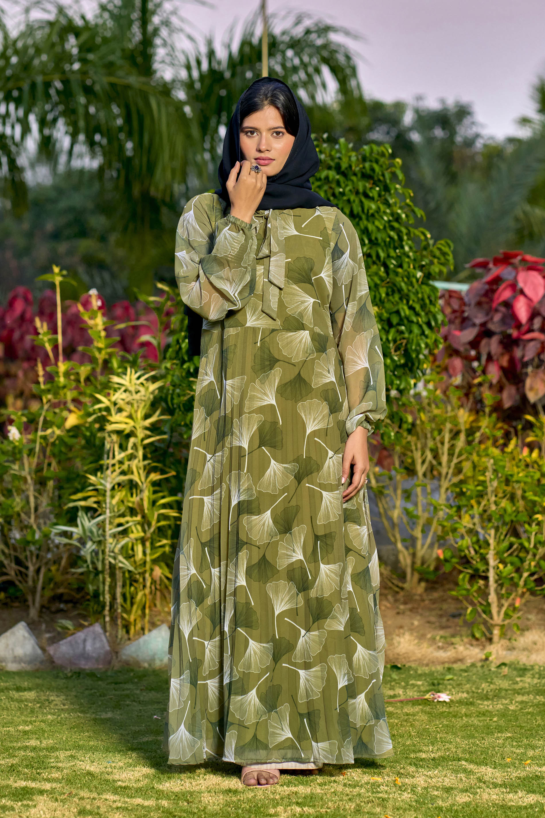 Elegant Green Printed Maxi Dress with Belt – Full Sleeve | Modest & Stylish