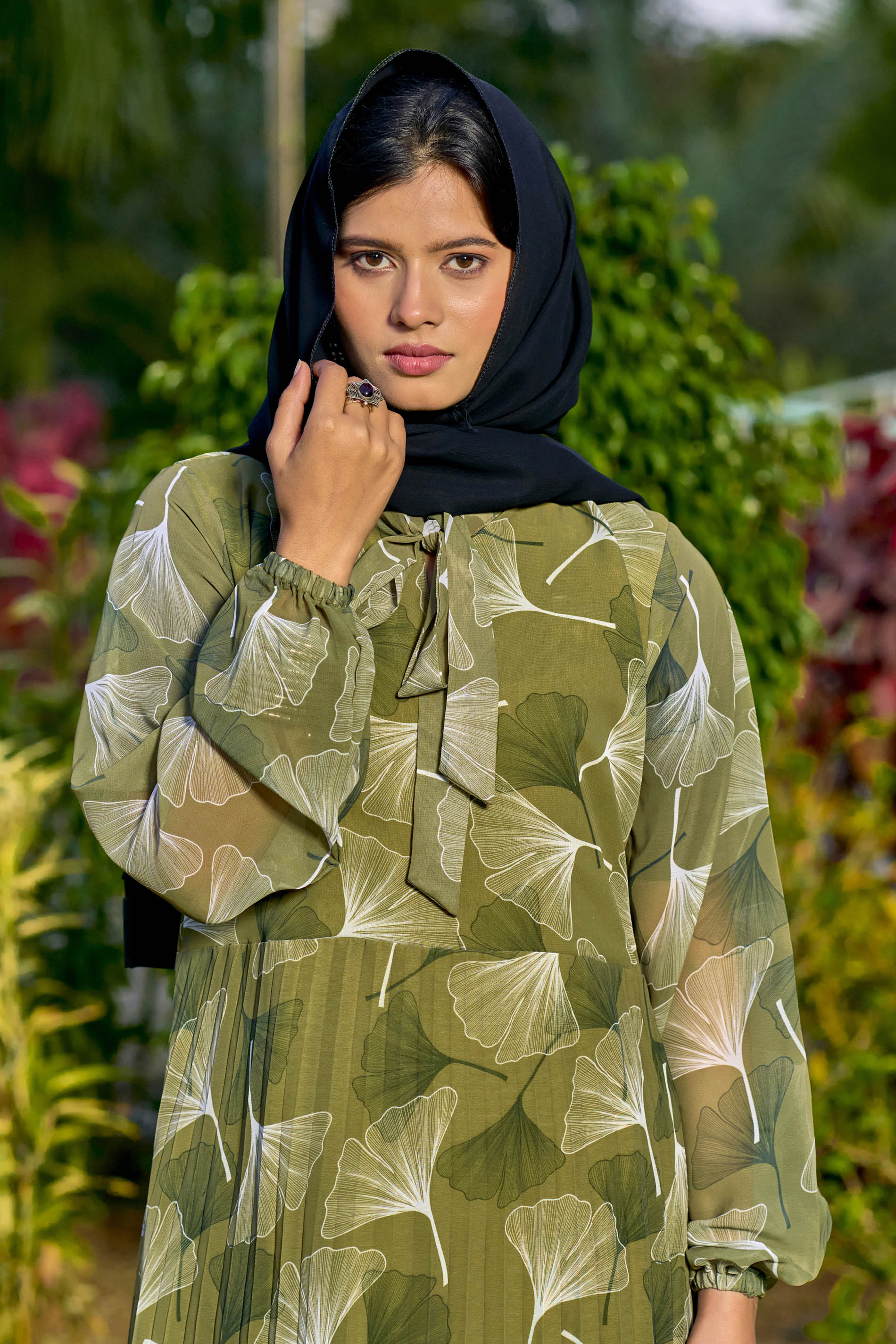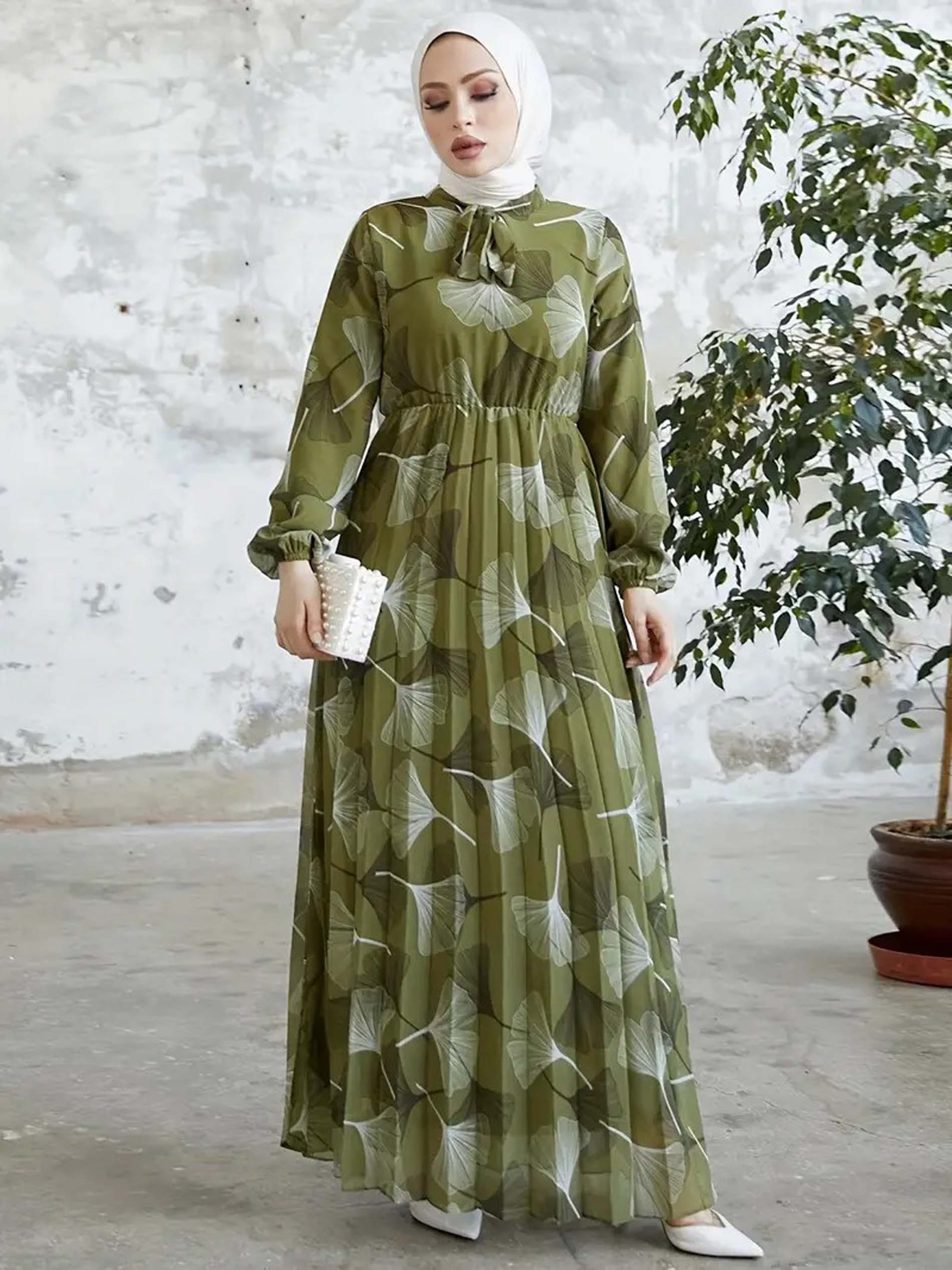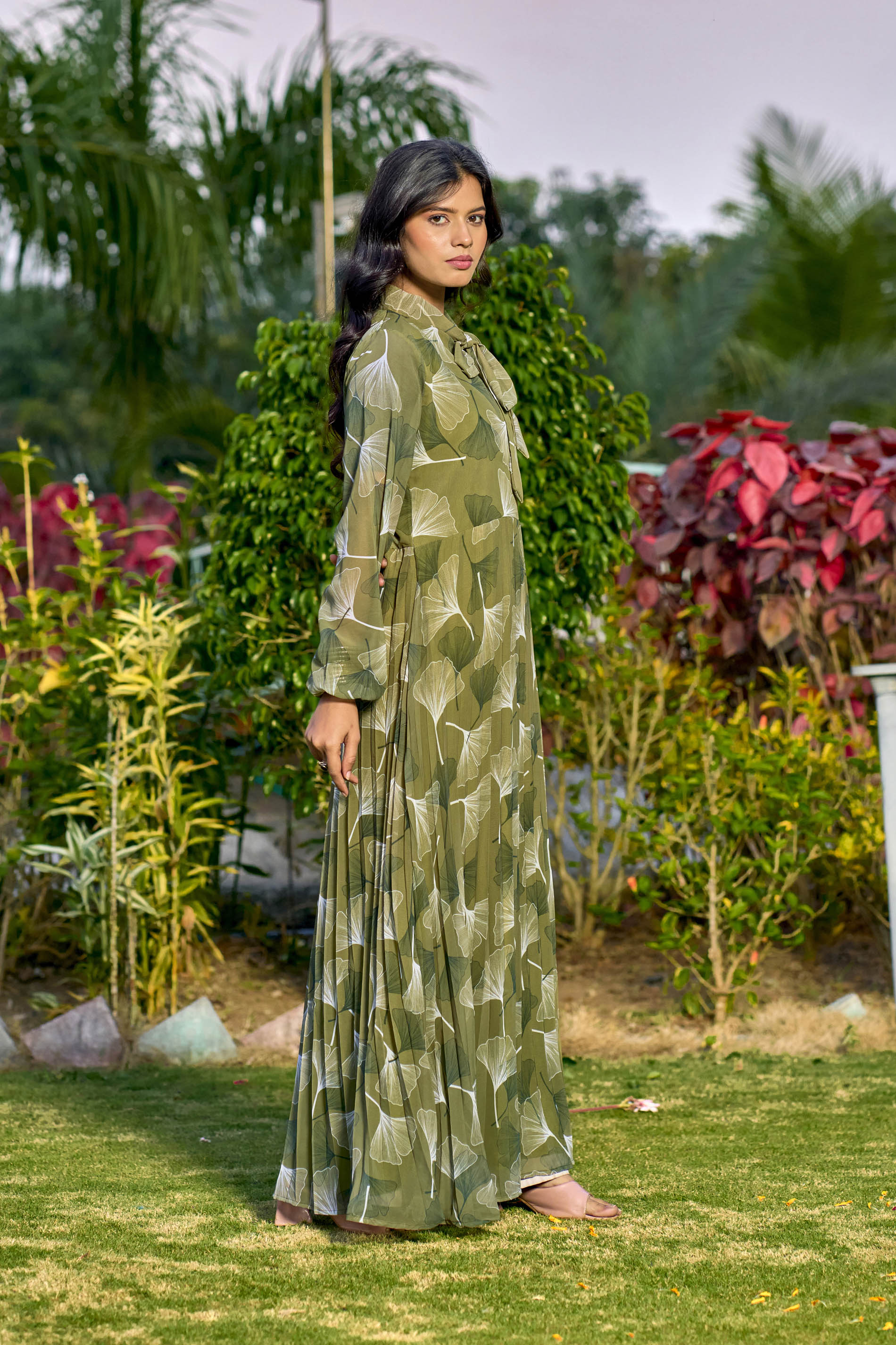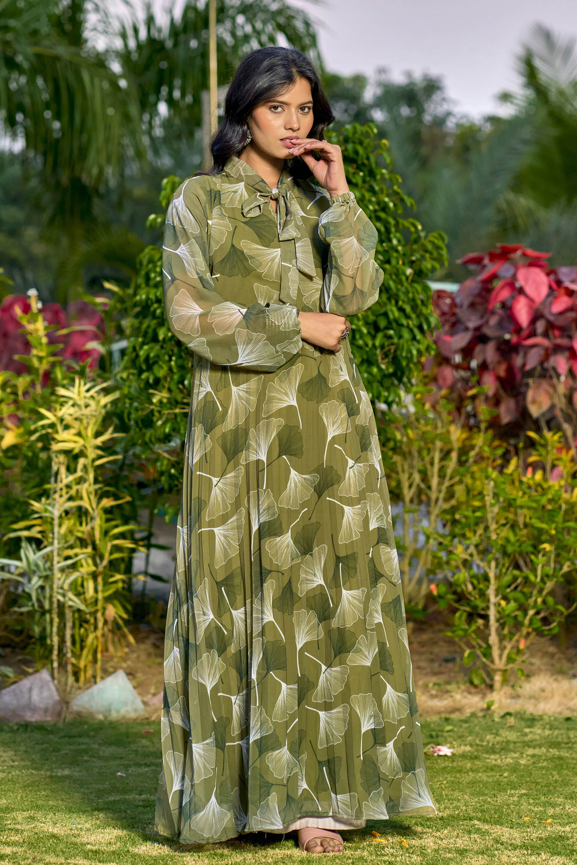 Elegant Green Printed Maxi Dress with Belt – Full Sleeve | Modest & Stylish