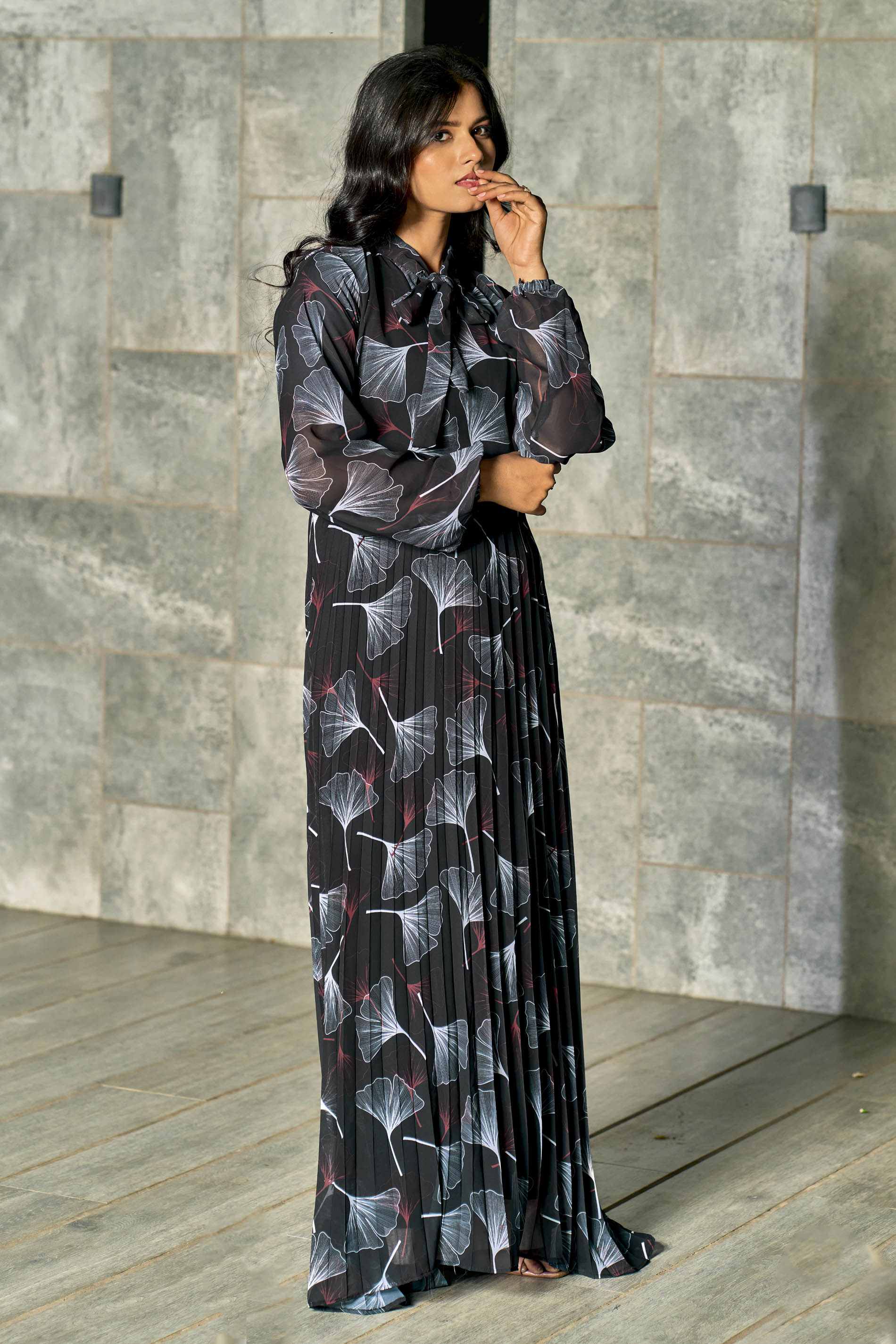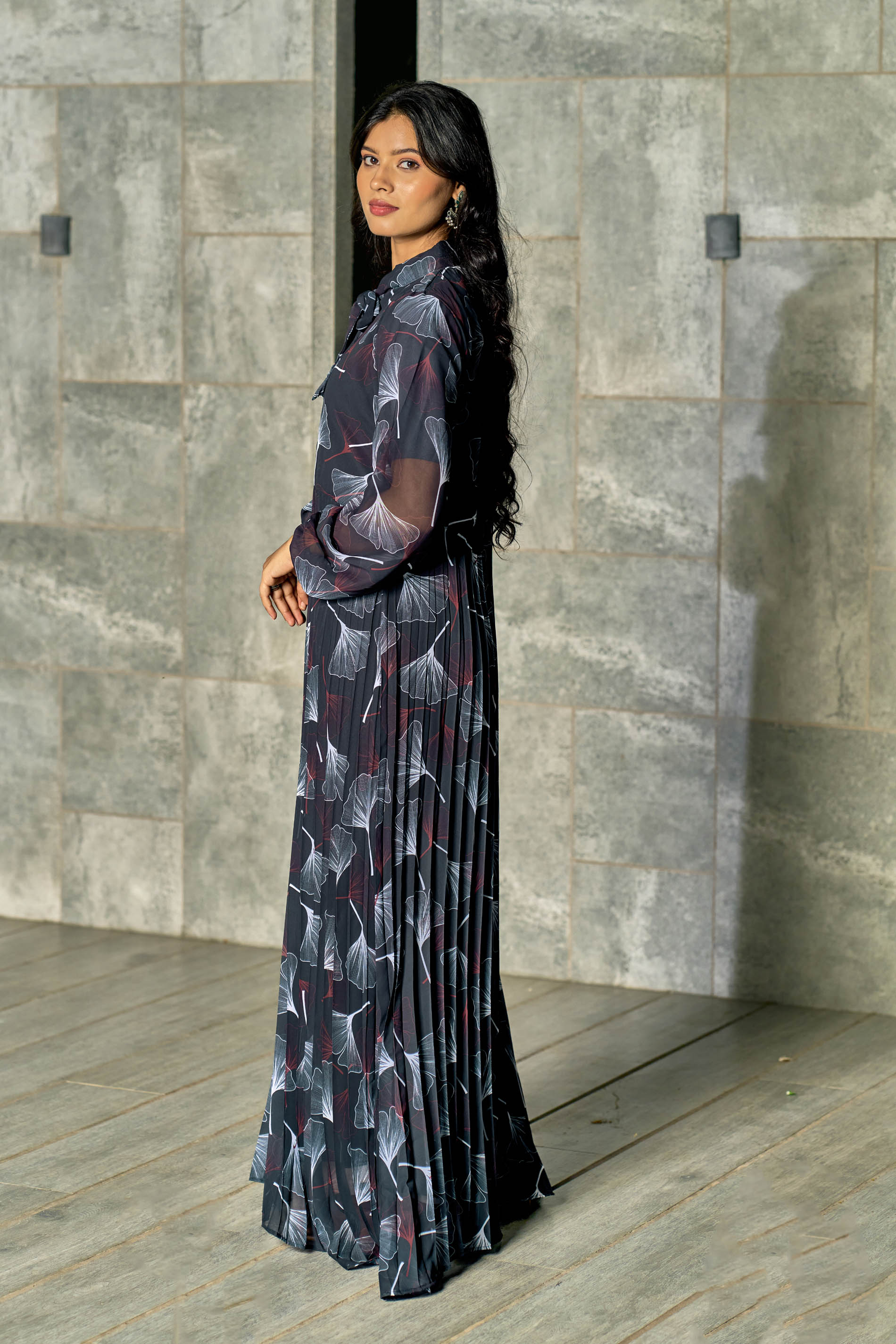 Elegant Grey Pleated Maxi Dress with Floral Print, Belted Waist & Side Pockets