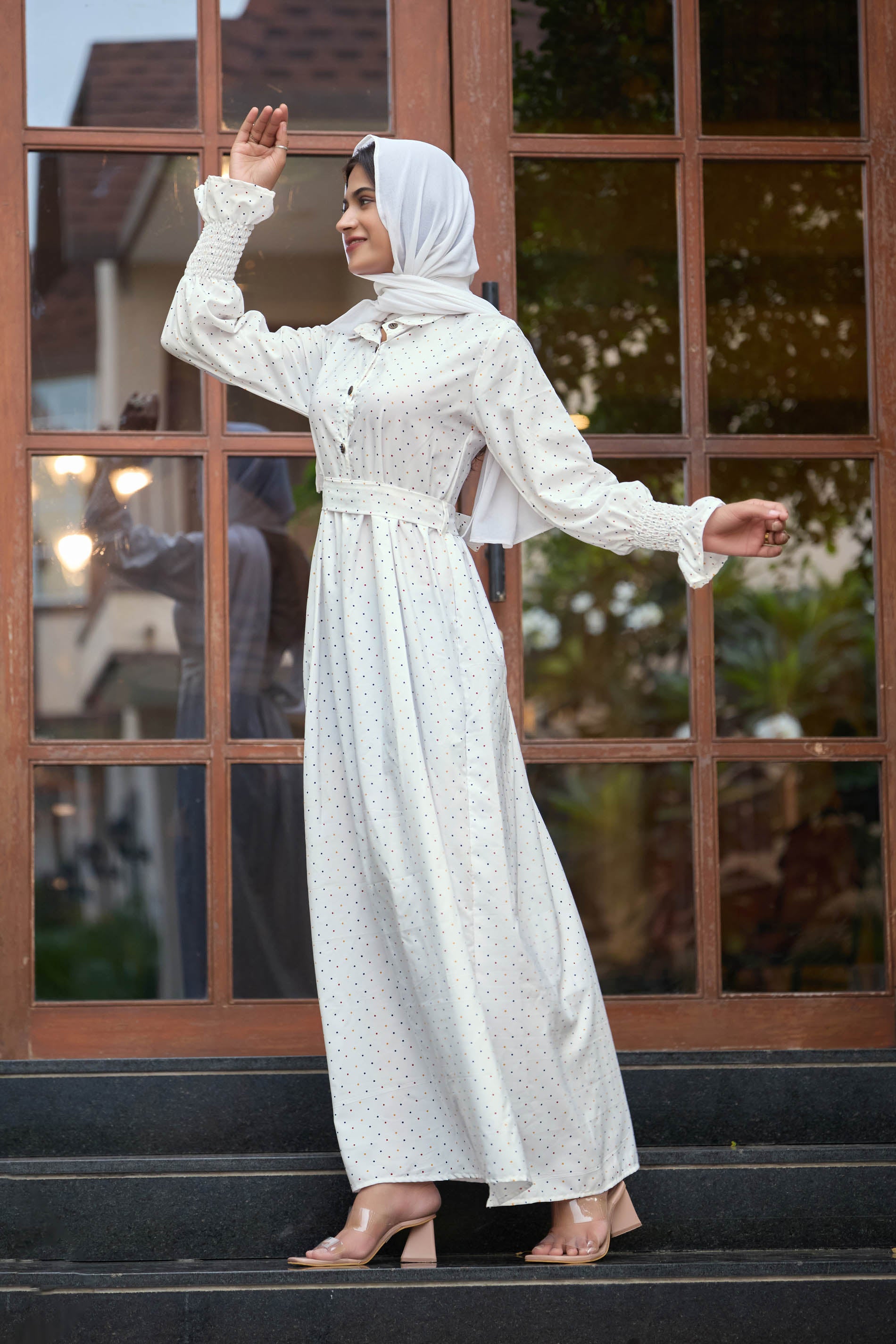White Polka Dot Long Maxi Dress for Women – Full Sleeve Modest Ethnic Wear with Belted Waist & Button Detail