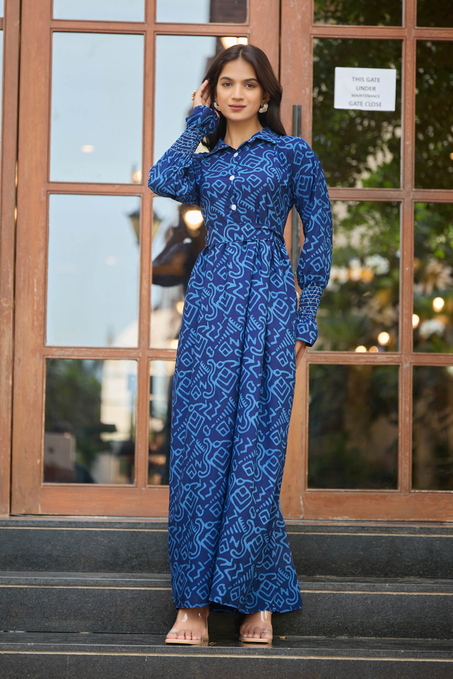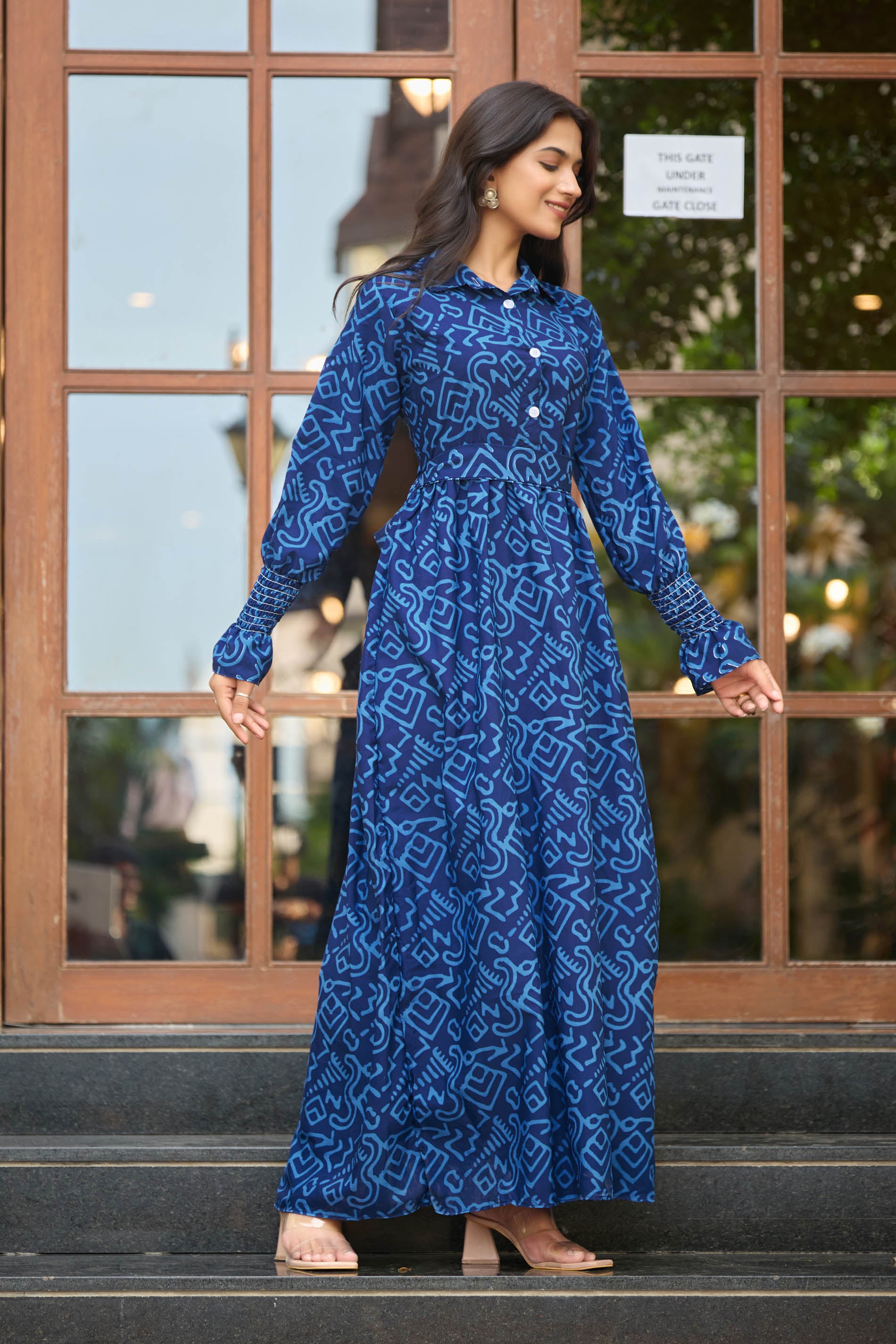 Women’s Blue Abstract Printed Maxi Dress with Full Sleeves