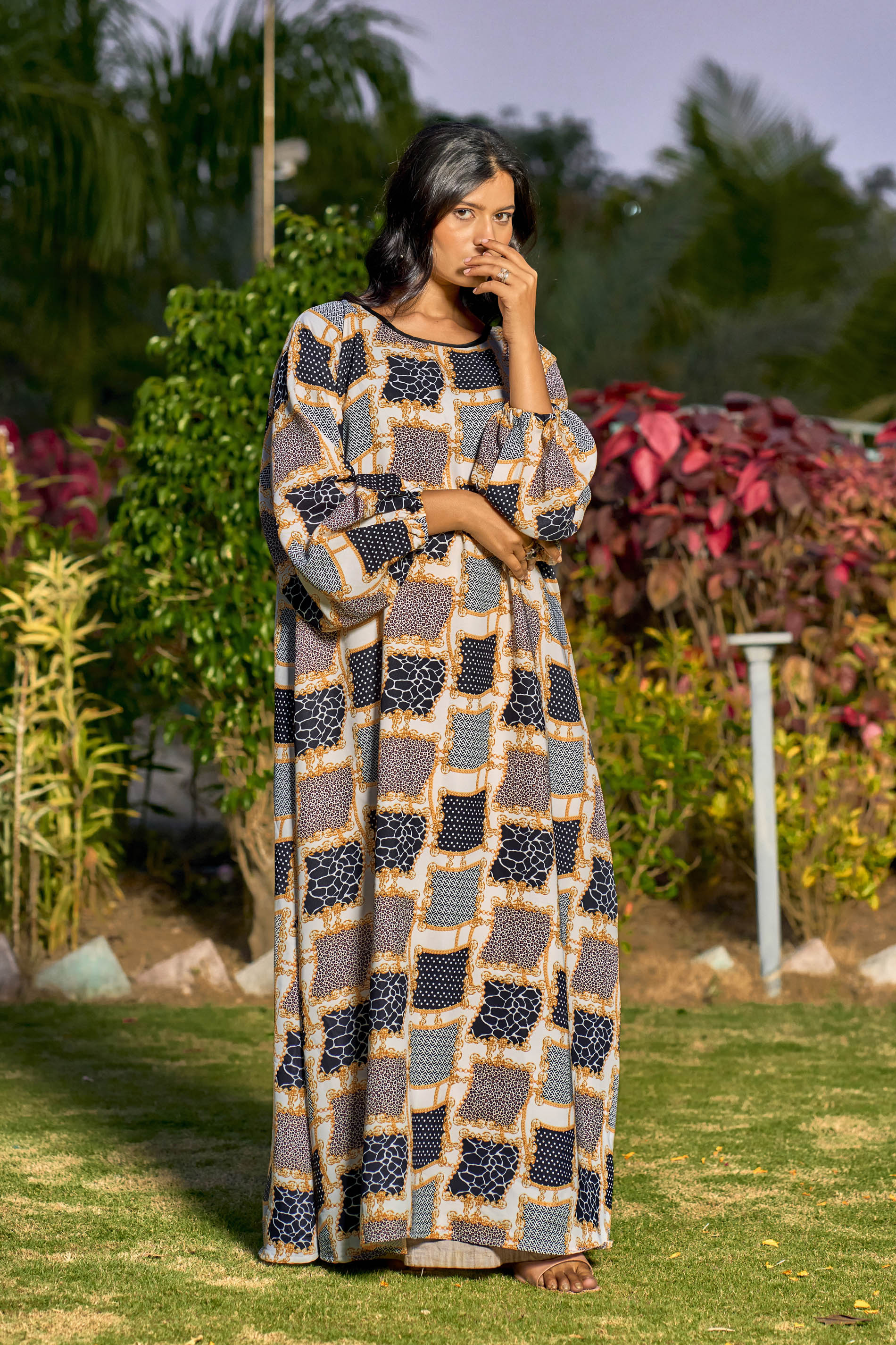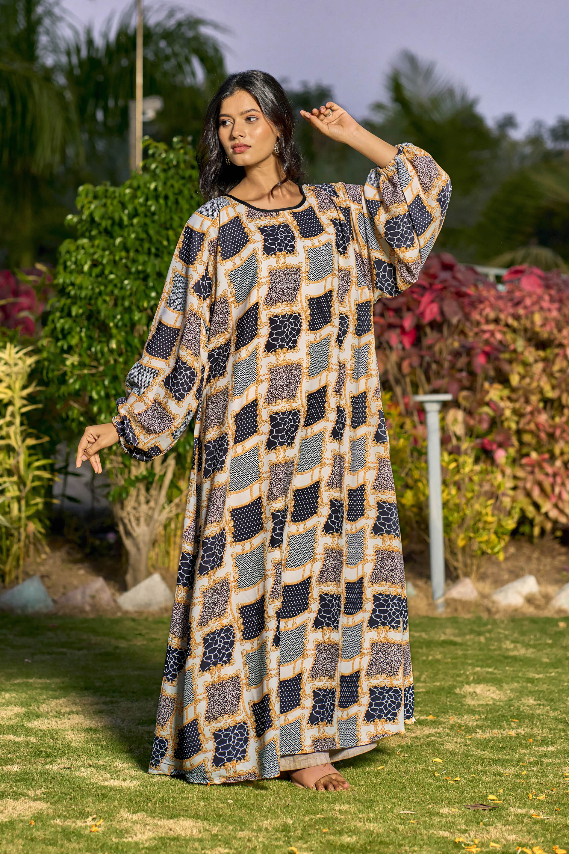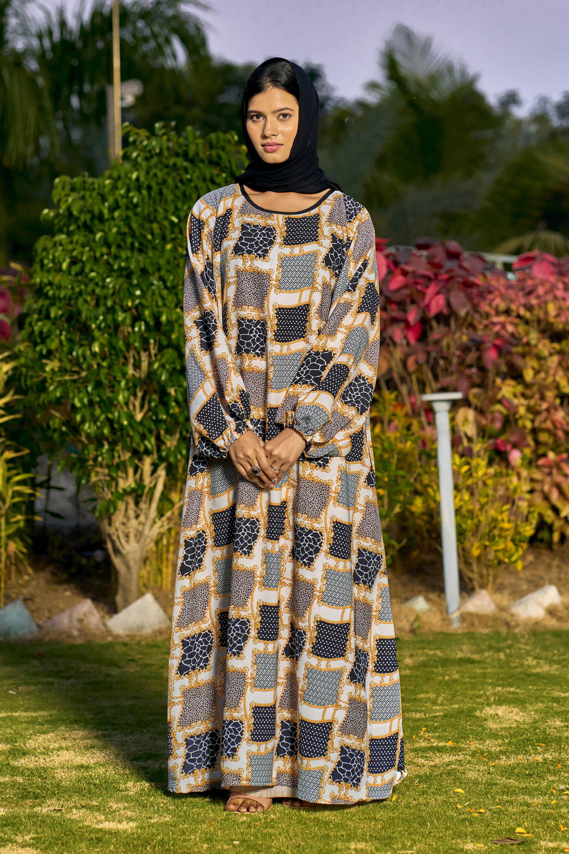 Multi-Color Abstract Print Maxi Dress – Modest Full Sleeve Abaya for Women