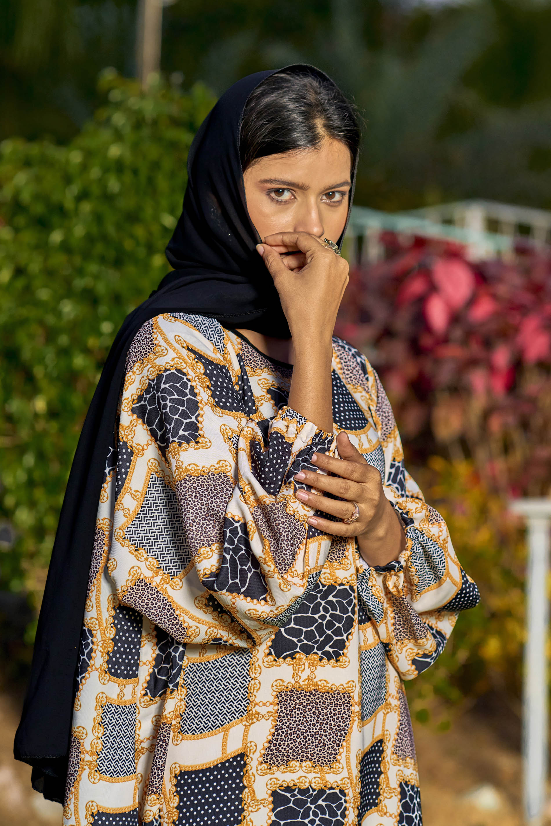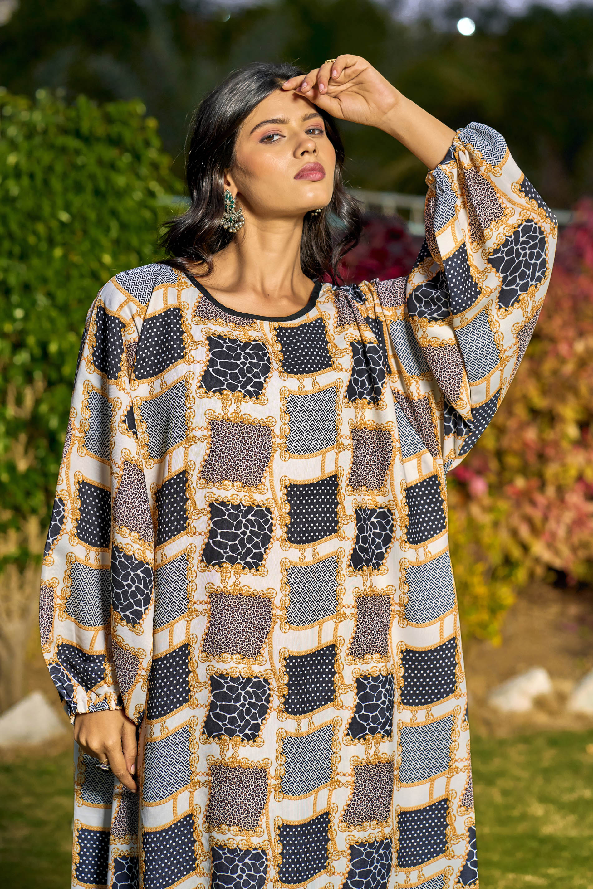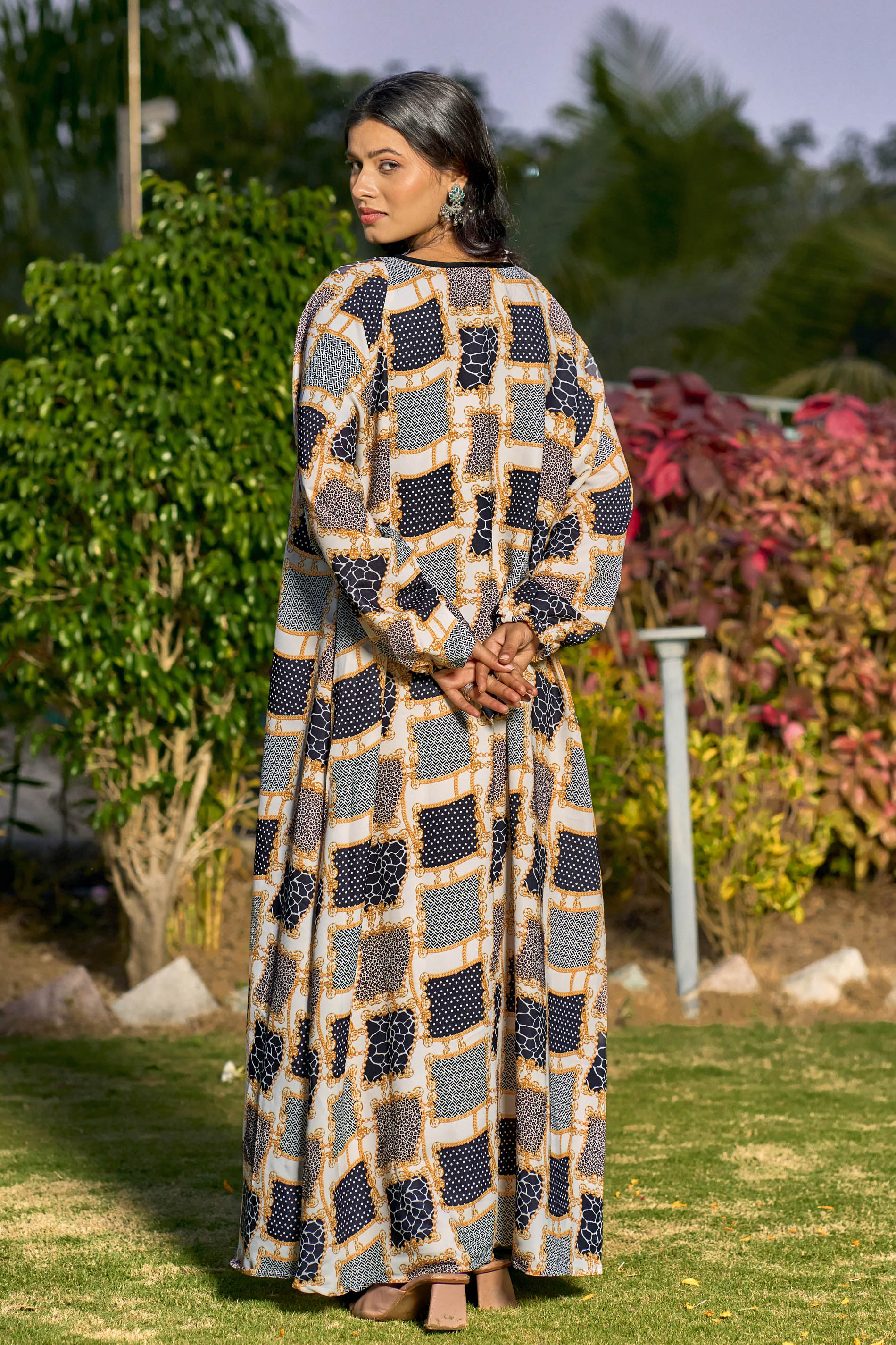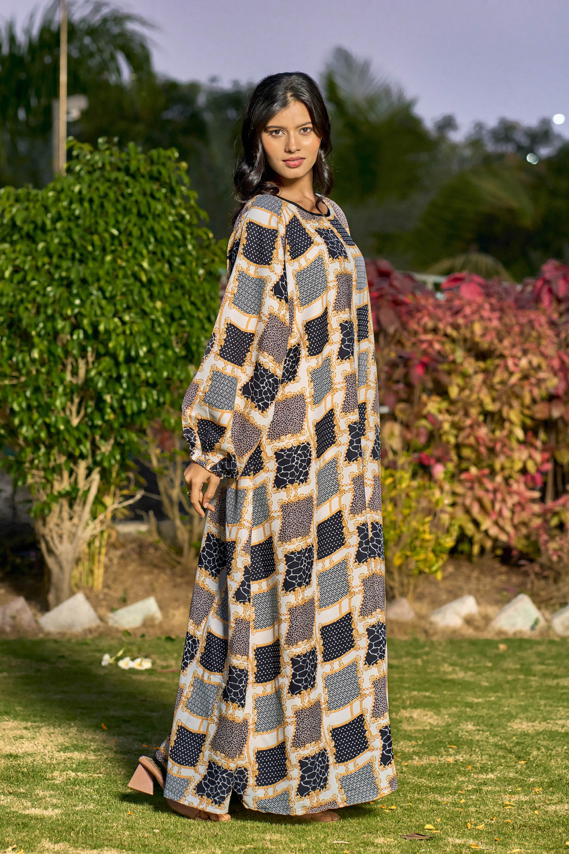 Multi-Color Abstract Print Maxi Dress – Modest Full Sleeve Abaya for Women