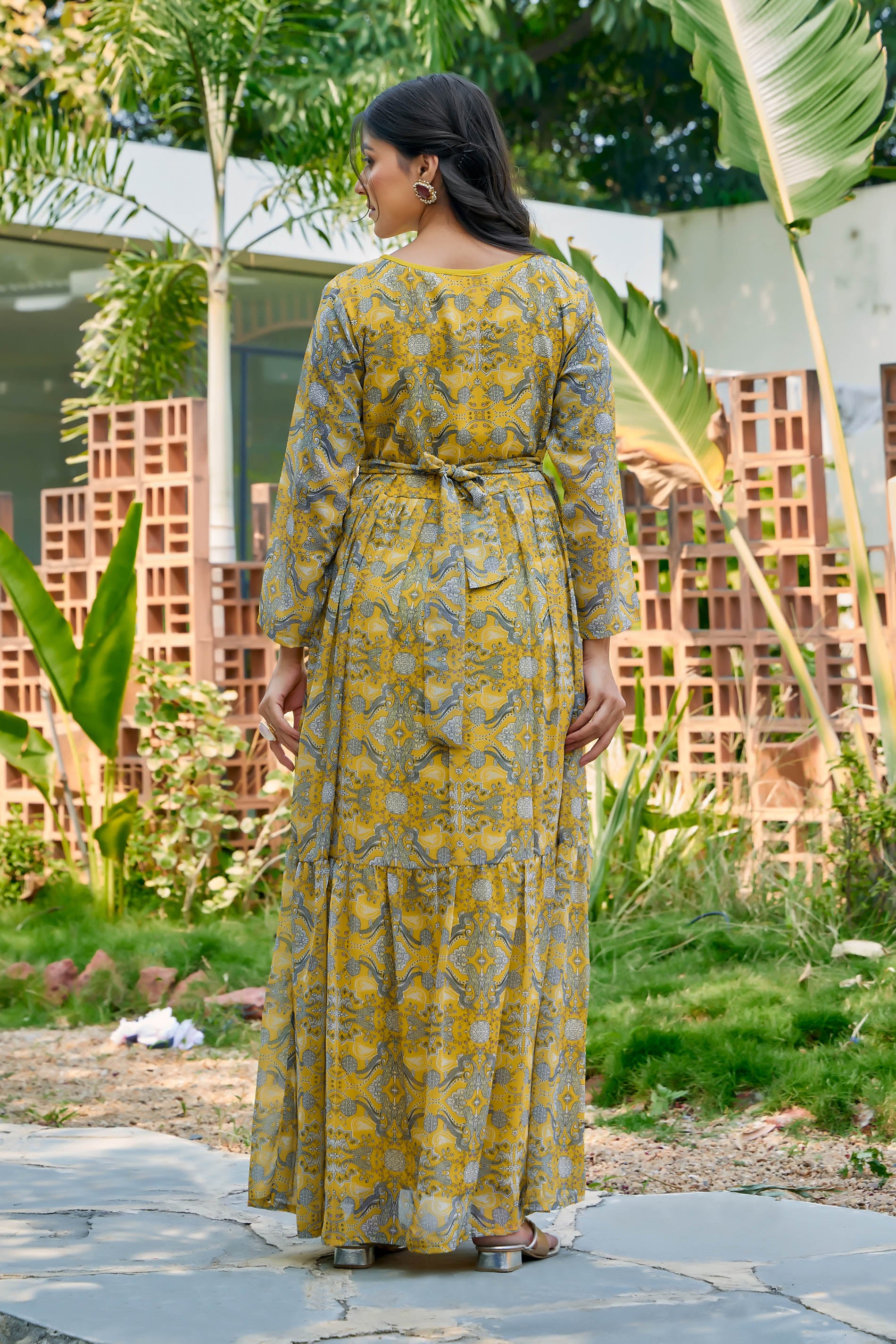 Women’s Yellow Printed Georgette A-Line Print Abaya with Waist Belt