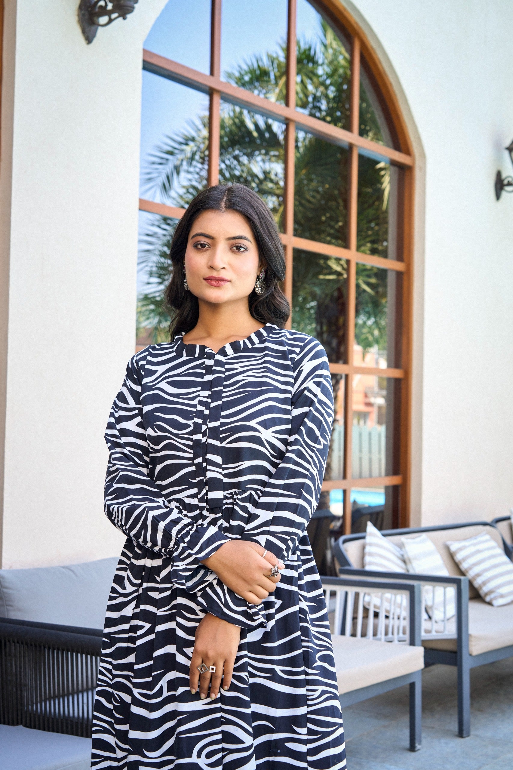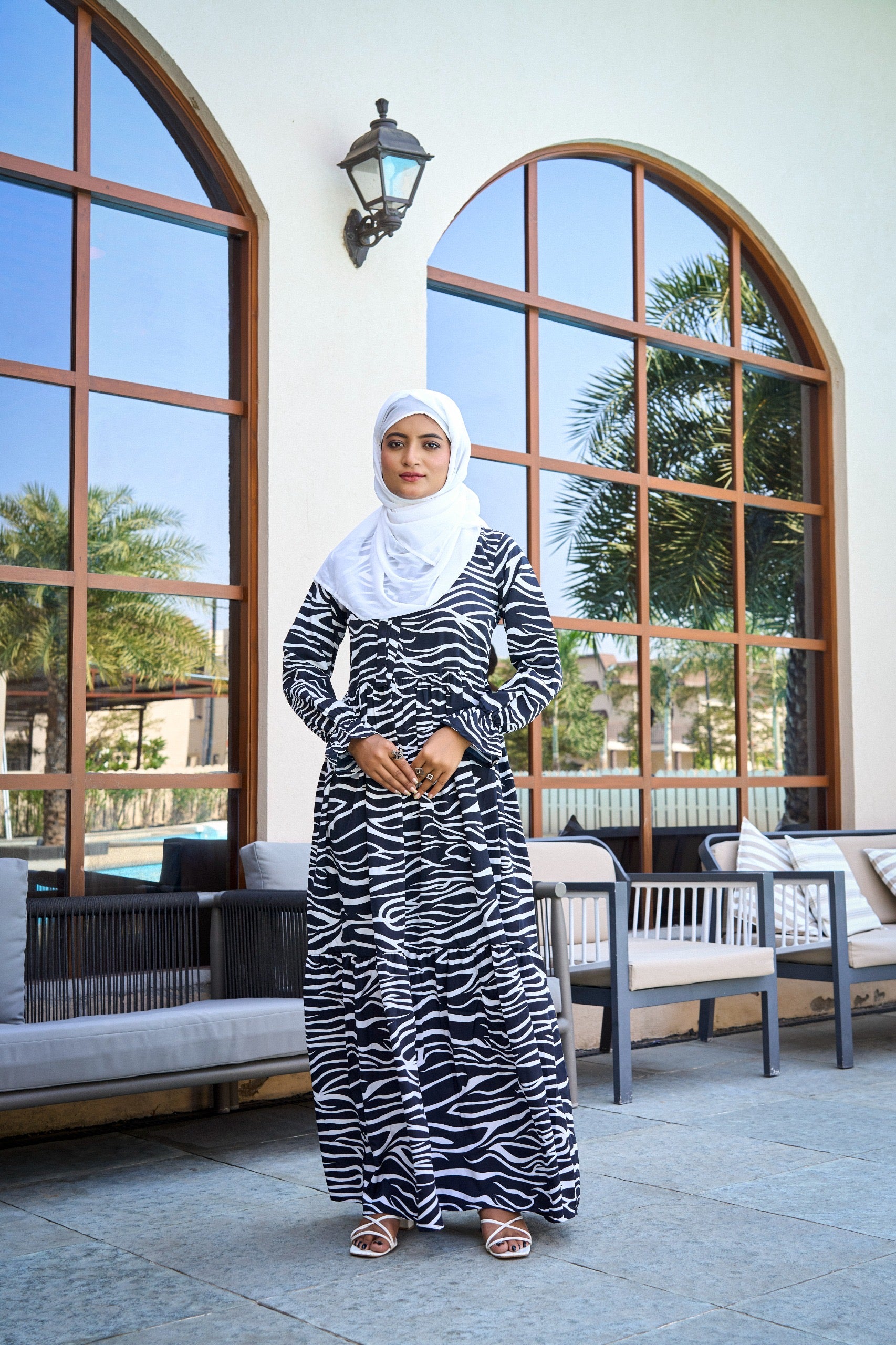 Whether you're looking for a sophisticated Abaya for a casual outing or a chic abaya for a modest yet fashionable statement, this versatile dress adapts to your unique style. Its full sleeves and modest cut provide excellent coverage while the bold zebra print ensures you stand out from the crowd.